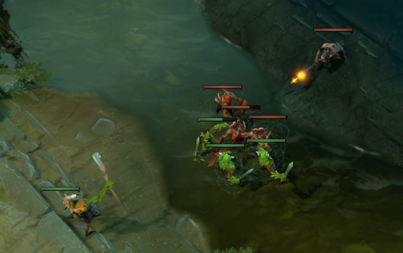 Lane creepsRadiant dan Dire masing-masing memiliki lane creeps. Creep radiant berwarna hijau dan Dire berwarna merah, ada tiga tipe creep yaitu melee, ranged dan siege. Melee creep adalah creep yang menggunakan senjata pedang jadi dia hanya dapat close combat, ranged adalah creep yang biasanya dibelakang creep-creep melee yang menggunakan senjata yang jarak jauh, sedangkan siege adalah creep catapault yang damagenya besar terhadap bangunan. Darah yang dimiliki ranged lebih kecil dibandingkan melee, maka lebih mudah untuk meng-lasthitnya. Creeps ini selalu muncul setiap detik ke-30.
